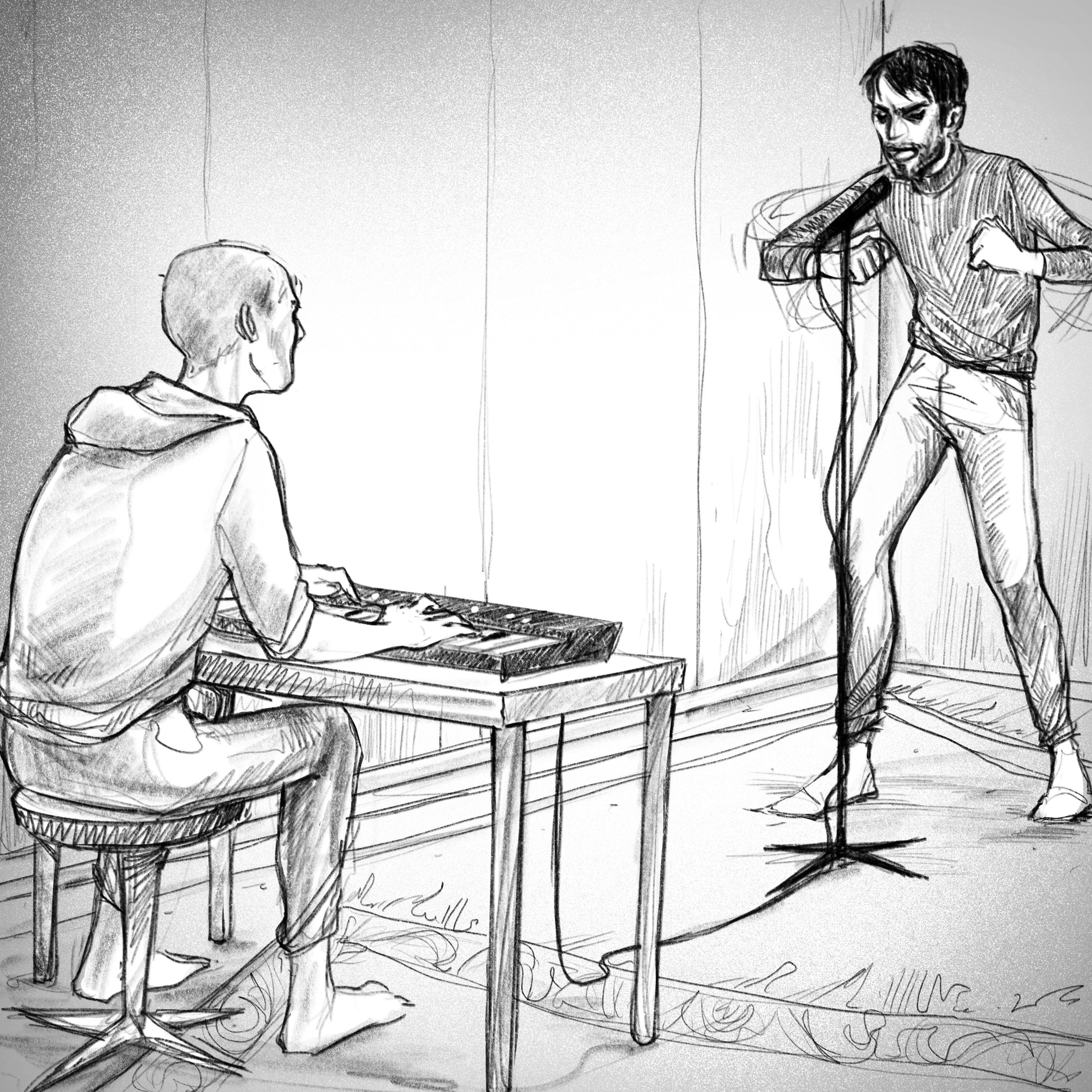 Unser nächster Song wird auf alle Fälle wieder auf Avas eigenem kleinem Label erscheinen. Und zwar - wenn alles gut geht - am 24. März. Gerade wird er noch gemastert. Ich bin ziemlich aufgeregt. Der Song schlägt eine ganz neue Richtung ein und ich bin mir nicht sicher, ob sie euch gefallen wird. Hier ist ein Bild, das ich während der Aufnahmen gezeichnet habe. Könnt ihr erraten, was Till und Hans hier machen?